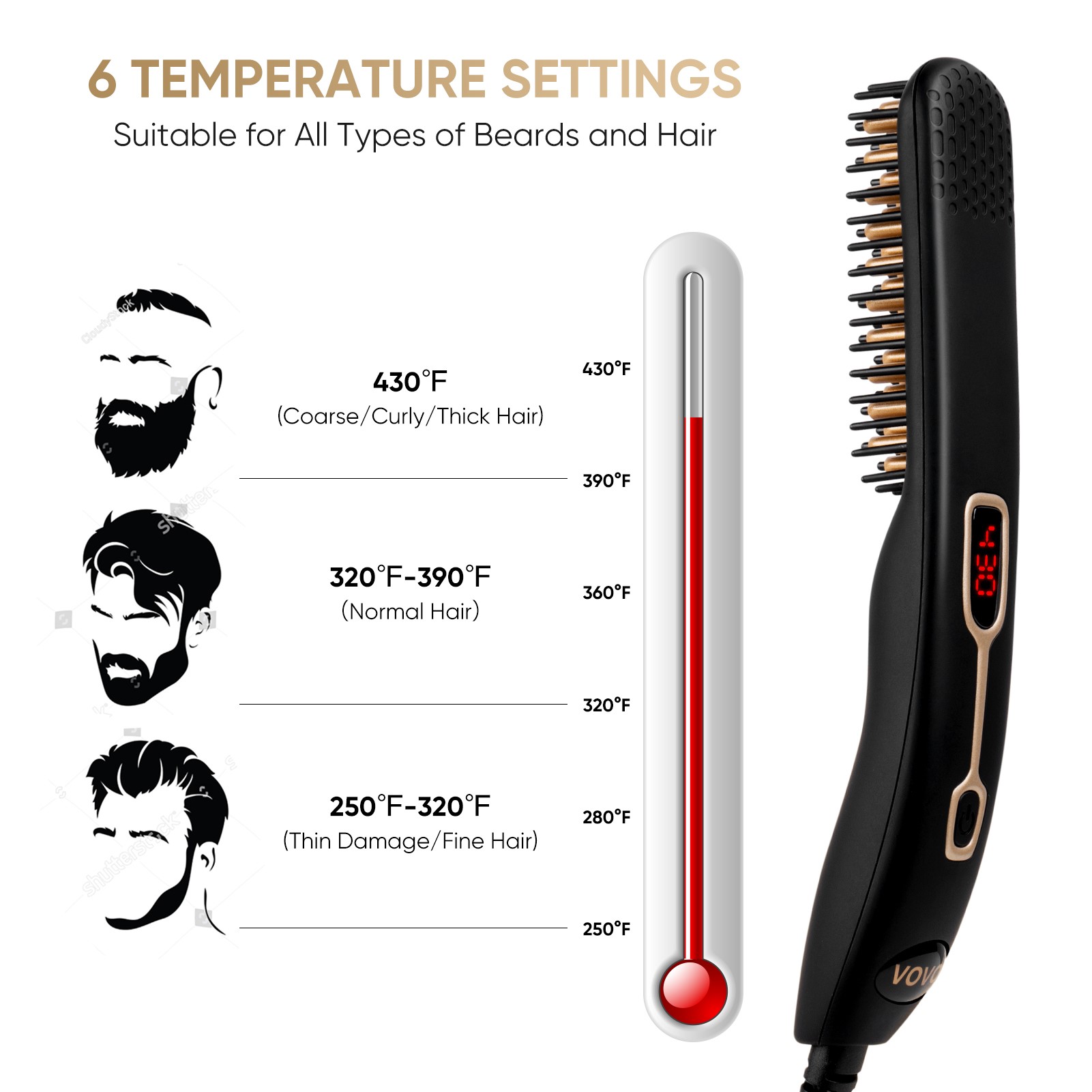 • 实用性和兼容性合而为一-您是否对发型设计的令人满意结果感到失望?我们的胡须矫直梳提供6种温度设置,包括250/280/320/360/390/430℉,适用于大多数胡须,头发稀疏,稀薄,浓密或卷曲的男人。使用时正确选择温度会产生令人满意的结果,建议胡须长度为2英寸或更长。注意:请使用硅树脂涂层,请勿触摸加热部分